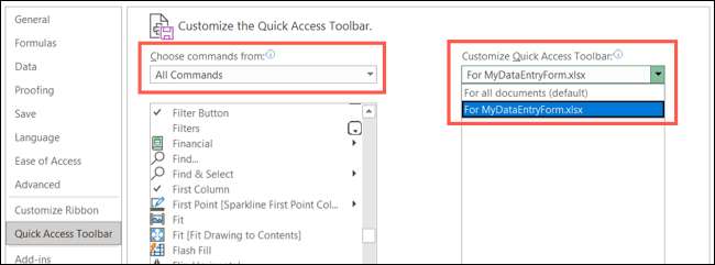 右側の「クイックアクセスツールバーのカスタマイズ」ドロップダウンボックスで、フォームボタンをすべての文書または現在のものに追加するかどうかを選択します。