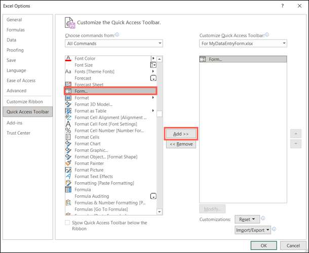 [すべてのコマンド]リストをスクロールして[フォーム]を選択します。 「追加」ボタンをクリックしてツールバーに追加します。
