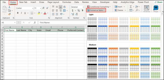 データを含むセルを選択してください。ホームタブとリボンのスタイルセクションに移動します。 「表としてフォーマット」をクリックして、テーブルスタイルを選択します。
