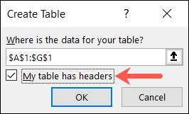 テーブルの[作成]ポップアップウィンドウで、セル範囲を確認して[My Tableにヘッダーがある]ボックスをオンにします。 「OK」をクリックしてください。