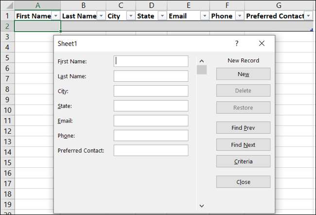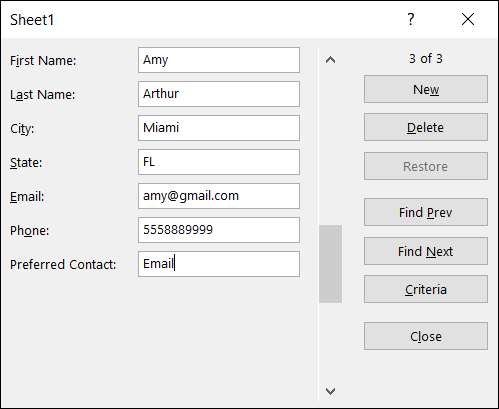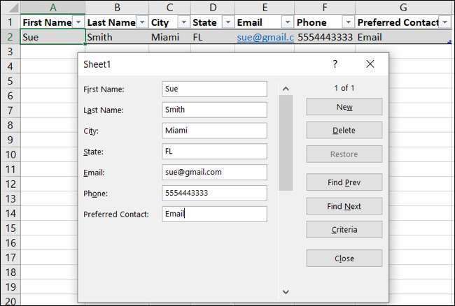 これであなたがしなければならないのはあなたのフォームにデータを入力し始めることです!テーブル内の任意のセルを選択し、フォームボタンをクリックします クイックアクセスツールバーに追加されました 。