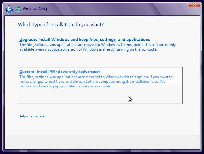 Windows7またはWindows8のインストール中に個別のデータパーティションを作成するには、[カスタムインストール]オプションを選択する必要があります。 「どのタイプのインストールが必要ですか?」に到達するまで、通常どおりインストールプロセスを実行します。画面をクリックし、[カスタム]オプションをクリックします。
