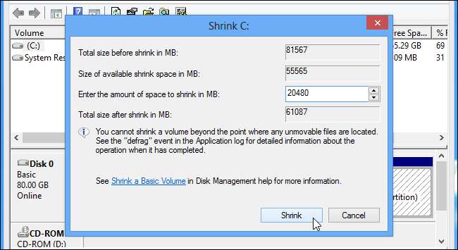 パーティションを縮小するスペースの量をMB単位で入力します。たとえば、100 GBのデータパーティションが必要な場合は、ボックスに102400と入力し、[縮小]ボタンをクリックします。
