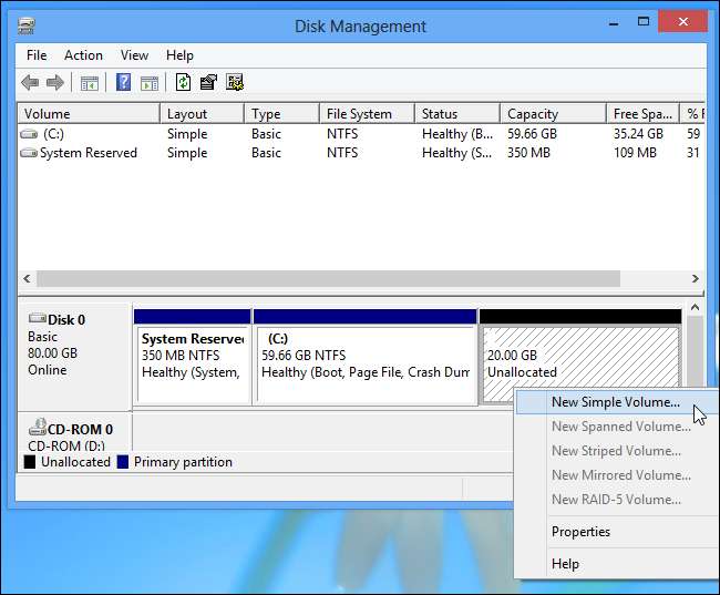 プロセスが完了したら、未割り当て領域内を右クリックし、[新しいシンプルボリューム]を選択して、パーティション化されていない領域から新しいパーティションを作成します。