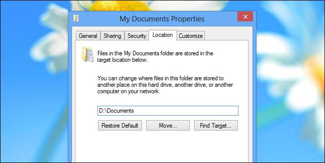 個別のデータパーティションを最大限に活用するには、個人データファイルをそのパーティションに保存します。これを簡単にするために、Windowsエクスプローラー(またはWindows 8のファイルエクスプローラー)で各フォルダーを右クリックして、ユーザーデータフォルダー(ドキュメント、ダウンロード、音楽、写真、ビデオなどのディレクトリ)を外部ハードドライブに移動できます。 )および[場所]タブのオプションを使用します。