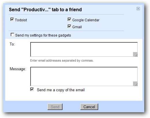 他の誰かがあなたのタブを気に入っていると思われる場合は、共有するタブの右側にあるドロップダウンメニューから[このタブを共有する]オプションを選択して、タブを送信できます(タブの追加に使用したものと同じです)。このオプションを使用すると、タブ付きページのガジェットの一部またはすべてを他のユーザーと共有できます。共有する各ガジェットの横にあるチェックボックスをオンにして、共有する相手のメールアドレスを入力するだけです。ガジェットがどのように役立ったかを知らせるメッセージを必ず含めてください。 「コピーを送ってください…」オプションをチェックして、送信したメールのコピーを受け取ることもできます。