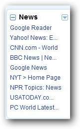 私もニュースについていくのが好きなので、私のお気に入りのニュースソースを含むタブ付きのページがあります。私はいつもGoogleリーダーを最初にチェックします。その他のお気に入りのニュースガジェットには、NPRとUSATodayがあります。また、テクノロジーとエンターテインメントのニュースについていくのも好きなので、PCWorldのトップテクノロジーニュースとYahooエンターテインメントニュースのガジェットを持っています。