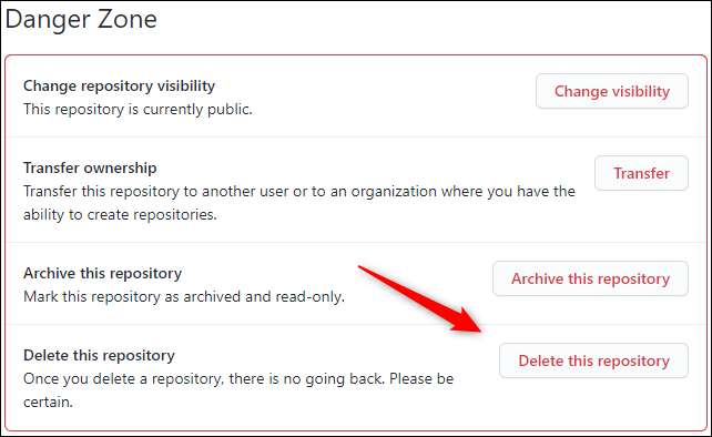 危険ゾーンセクションが表示されるまで、設定ページの下部までスクロールします。ここで、[このリポジトリを削除する]をクリックします。