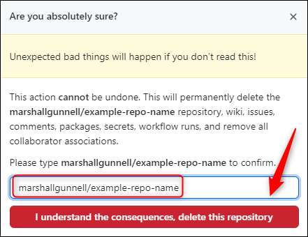 ポップアップメッセージが表示され、アクションが永続的であり、確認のためにRepo Nameを入力するように求められていることを確認します。警告を慎重に読んで、テキストボックスにRepo Nameを入力し、[結果を理解している[このリポジトリを削除します]をクリックします。