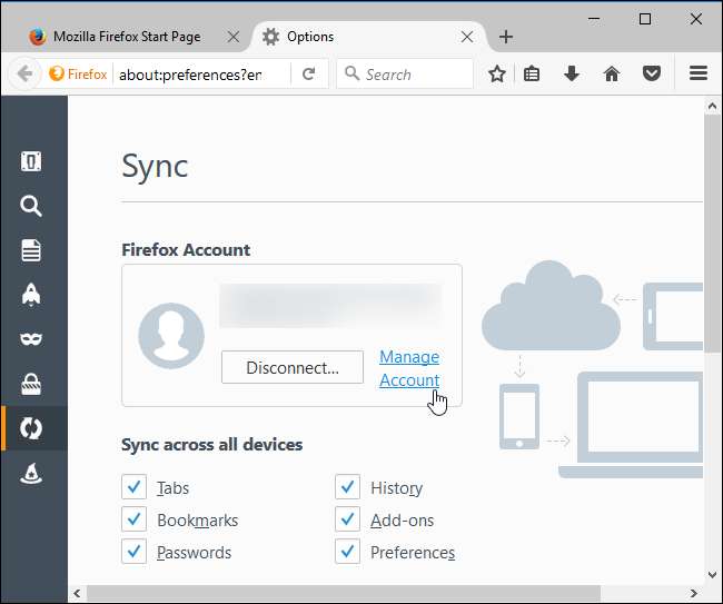 [同期オプション]ページの[アカウントの管理]リンクをクリックします。 FirefoxのWebサイトのアカウント管理ページに移動します。