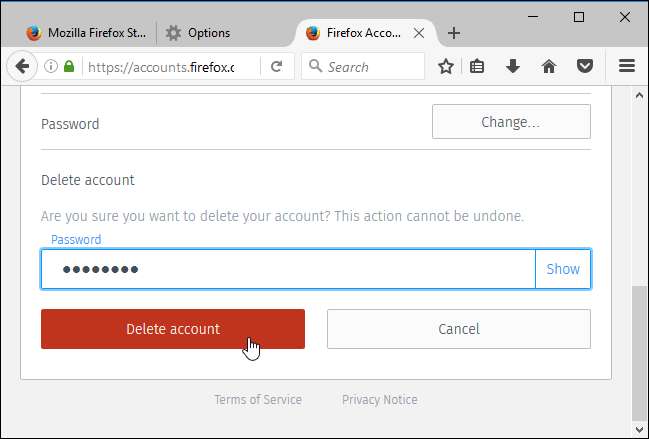 Firefoxアカウントのパスワードをもう一度入力し、[アカウントの削除]ボタンをクリックします。アカウントは消去されます。
