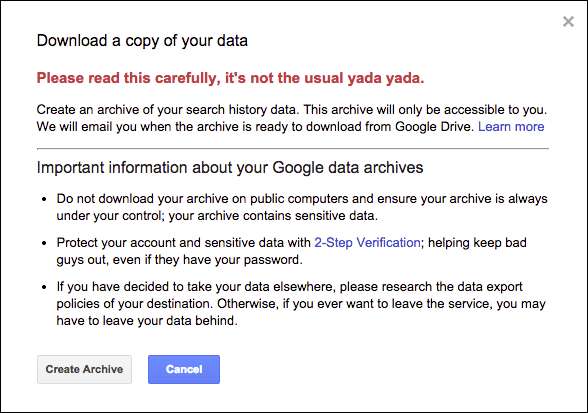 すべてを読むように強く促す厳しい警告が表示されます。アーカイブされたデータはGoogleドライブからダウンロードできるようになるため、公共のパソコンなどにこのデータをダウンロードしないでください。