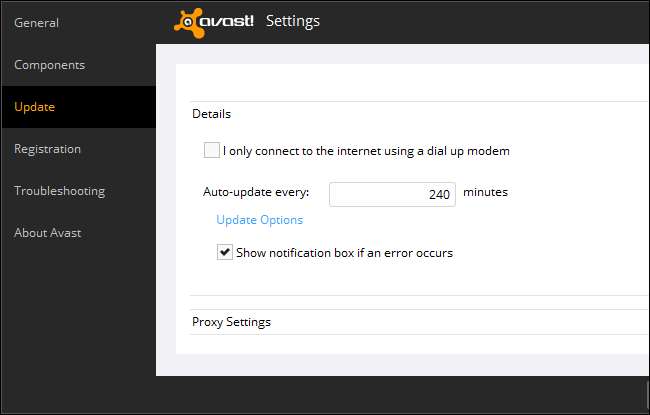 アバストは、ウイルス対策の更新が失敗したときにも通知を表示します。定期的に接続の問題が発生し、このエラーメッセージを表示したくない場合は、[設定]ウィンドウの[更新]セクションをクリックして、[エラーが発生した場合に通知ボックスを表示する]チェックボックスをオフにします。