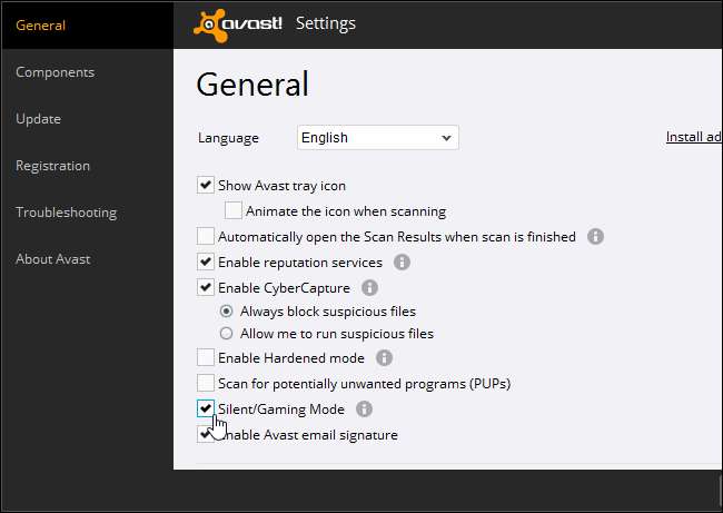 [全般]ペインの上部にある[サイレント/ゲームモード]チェックボックスをアクティブにして、サイレントモードを無効にするまですべてのアバストのポップアップメッセージを停止することもできます。