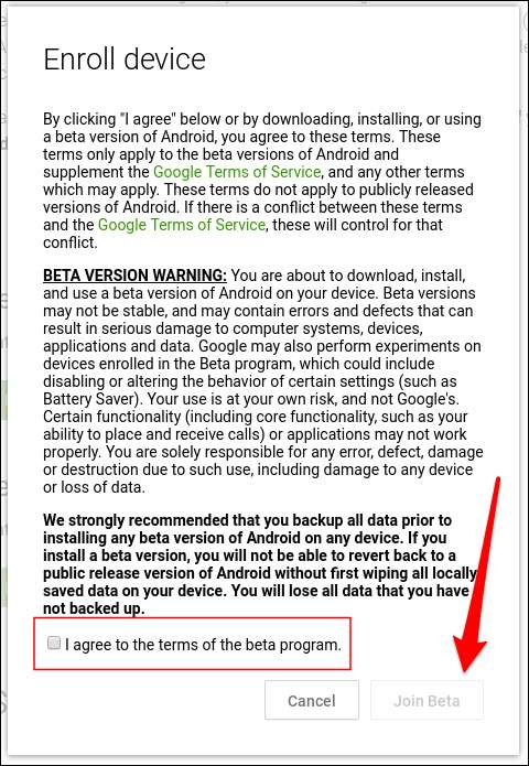 上記のデバイスのいずれかをGoogleアカウントに接続している場合は、次のことができます ここに向かう ベータプログラムを開始します。 Googleアカウントでサインインした後、ボタンをクリックする前に、すべての警告を必ずお読みください。特に、ベータプログラムをオプトアウトして、Androidの最新の安定バージョンにロールバックする場合は、デバイスを出荷時設定にリセットしてワイプする必要があります。