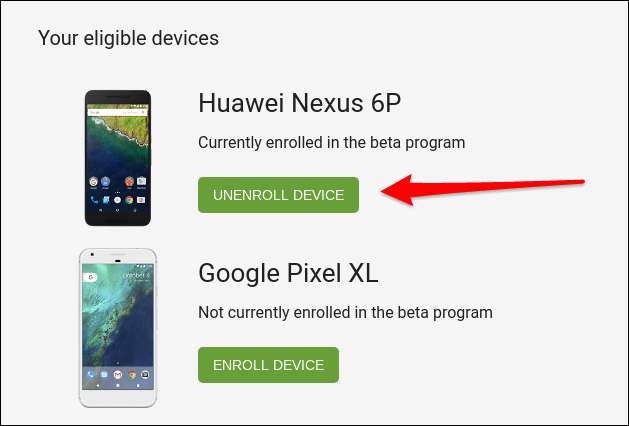OTA方式を使用してプログラムに登録した場合は、に戻るだけで済みます。 Androidベータプログラムのランディングページ ボタンをクリックして、デバイスの「登録を解除」します。ここでこれを覚えておいてください デバイスで出荷時設定へのリセットを実行します 、だから、すべてを失って最初からやり直しても大丈夫なら、それをやりなさい。現在、デバイスをワイプせずにロールバックする推奨される方法はありません。続行する前に、必要なものをすべてバックアップしてください。