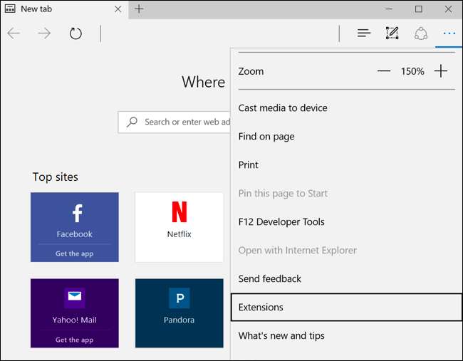 Microsoft Edgeに拡張機能をインストールするには、Edge Webブラウザーを開き、ウィンドウの右上隅にあるメニューボタンをクリックまたはタップして、[拡張機能]を選択します。