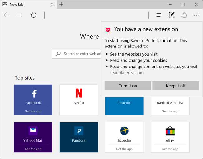 Microsoft Edgeに戻ると、拡張機能とそれに必要なアクセス許可を有効にするかどうかを尋ねるポップアップが表示されます。 「オンにする」をクリックまたはタップして、拡張機能を有効にします。