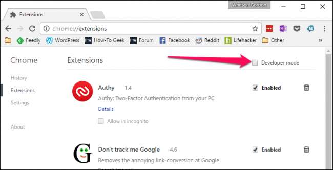 拡張機能を右クリックして[拡張機能の管理]を選択するか、ロケーションバーに入力して、chrome:// extensionsに移動します。そこに到達したら、右側の[デベロッパーモード]チェックボックスをオンにします。