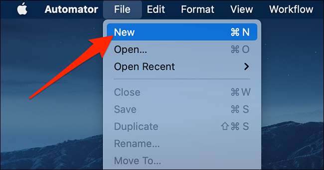 Automatorでは、ファイル&gtを選択します。新しいアプリを作成するには、上部のメニューバーの新機能。または、コマンド+ nを押します。