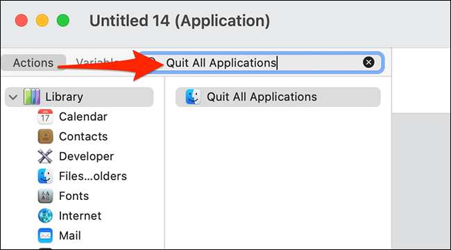 次に、Automatorのメインウィンドウが開きます。左上隅にある「アクション」を選択します。次に、[Actions]の横にあるテキストボックスをクリックし、[すべてのアプリケーションを終了]と入力します。