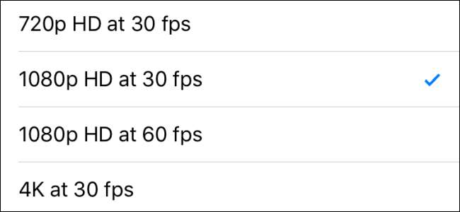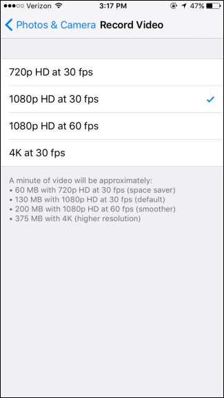 iPhone 6以降を使用している場合は、電話機が録画ビデオとスローモーションビデオをキャプチャする速度と解像度を変更できます。より少ないストレージを使用し、実際には携帯電話でビデオのみを表示したい場合は、解像度を低くするとスペースを節約できます。より高い解像度のキャプチャ(4Kなど)またはよりスムーズなビデオ(60fpsなど)が必要な場合は、設定を増やすとある程度のストレージスペースが必要になりますが、それだけの価値があるかもしれません。
