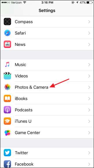 設定アプリを起動し、少し下にスクロールして、[写真とカメラ]をタップします。