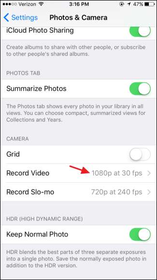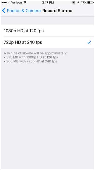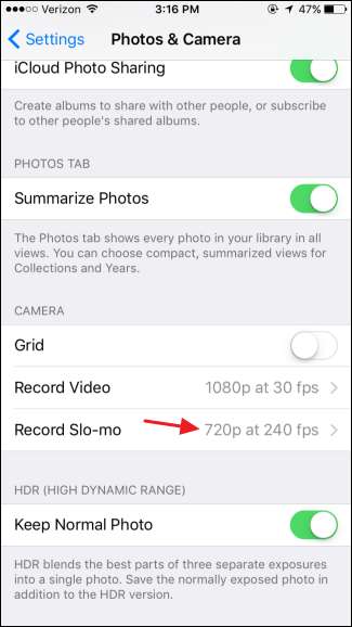録画するスローモーションビデオの品質を調整することもできます。写真とカメラのページに戻り、「スローモーションを記録」設定をタップします。
