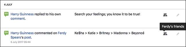 ニュースフィードを見ると、友達が高く評価したりコメントしたりした数十の投稿が表示されます。共有していない場合、それらのアイテムはタイムラインに表示されません。あなたの友達はあなたからすべて同じ通知を受け取ります。あなたが何を見ることができる唯一の方法 彼ら すべての人がアクティビティフィードを介して表示される可能性があります。各アイテムを見るだけで、誰がそれを見ることができるかがわかります。たとえば、下のスクリーンショットでは、Ferdyのすべての友達が、私が彼の投稿にコメントしたことを確認できます。おそらく Facebookのアルゴリズム 私たちの共通の友人の何人にもその活動を示しました。