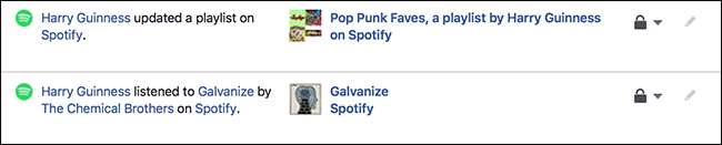 アクティビティフィードは、知らないうちにアプリが何かをしていないことを確認するのにも役立ちます。たとえば、編集者は、新しいアプリに何かをする許可を与えるたびに、タイムラインに投稿されていないことや何かおかしなことをしていないことを確認するためにチェックしていると言います。その下にあるのは、SpotifyがFacebookに何かをプッシュしたにもかかわらず、私だけがそれを見ることができることです(ロックアイコンはそれがプライベートであることを示しています)。