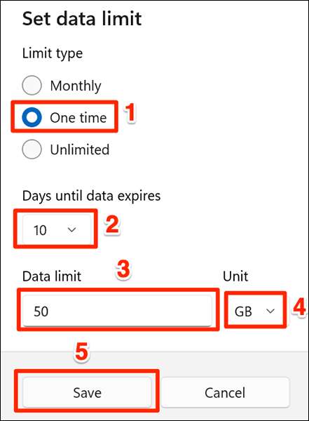 1回限りのオプションを指定した場合は、[データが期限切れになるまで]ドロップダウンメニューをクリックして、データが期限切れになる日数を選択します。 [データ制限]ボックスをクリックして、許可されたデータの量を入力します。 [単位]ドロップダウンメニューからデータユニットを選択します。