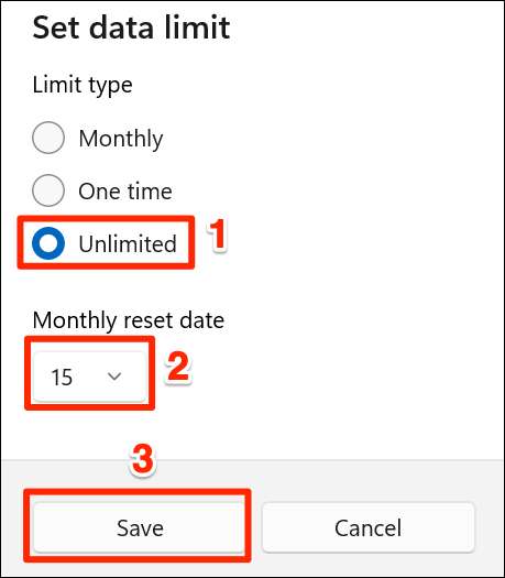 無制限に選択した場合は、[月刊リセット日]ドロップダウンメニューをクリックして、データキャップが期限切れになる日付を選択します。