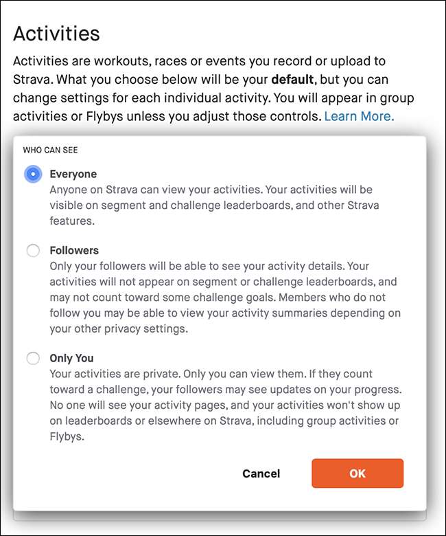 Stravaに記録するものはすべてアクティビティです。 「アクティビティ」メニューの設定は、将来のアクティビティのデフォルトのプライバシー設定を変更するだけです。記録するときに、それぞれを共有または非表示にするオプションが常にあります。 3つのオプションは、「全員」、「フォロワー」、「あなただけ」です。