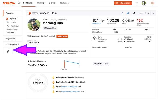 アクティビティごとにプライバシー設定を行うことができます。たとえば、ベストランを公開し、毎日のトレーニングセッションを非表示にすることができます。特定のアクティビティの設定をカスタマイズするには、Stravaでそれを開き、[編集]アイコン(鉛筆)をクリックします。