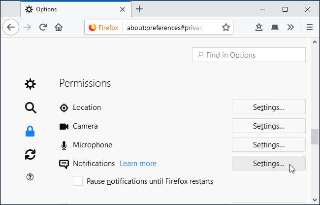 Firefox 59以降、Firefoxでは通常の[オプション]ウィンドウですべてのWeb通知プロンプトを無効にできるようになりました。また、信頼できるいくつかのWebサイトに通知の表示を許可しながら、Webサイトが通知の表示を要求しないようにすることもできます。