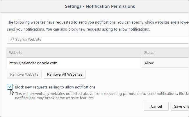 新しいWebサイトからの通知要求の表示を停止するには、[通知の許可を求める新しい要求をブロックする]チェックボックスをオンにして、[変更を保存]をクリックします。現在リストにあり、「許可」に設定されているWebサイトは、引き続き通知を表示できます。