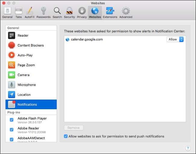 ウィンドウ上部の「ウェブサイト」タブを選択し、サイドバーの「通知」をクリックします。