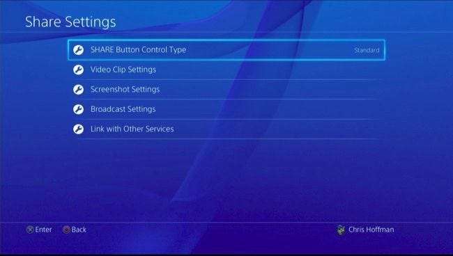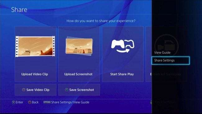 [共有]ボタン、動画、スクリーンショットの設定をカスタマイズできます。これを行うには、最初にゲームの「共有」ボタンを押して「共有」メニューにアクセスします。コントローラの「オプション」ボタンを押して、「共有設定」を選択します。