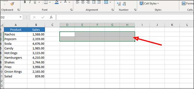 クリックしてドラッグして、空のセルのグループを強調表示します。理想的な世界では、式が配列で、必要なセルの数を正確に強調表示する必要があります。私たちはそれをするつもりはありません。その後の式を修正します。