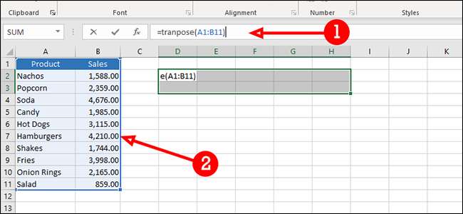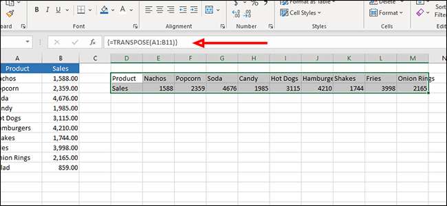 "= transpose"を式バーに(引用符なし)を入力してから、転置したいデータを強調表示します。式を実行するには「Enter」を押すのではなく、Ctrl + Shift + Enterキーを押します。