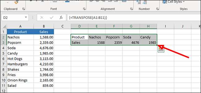 ご覧のとおり、私たちはアレイのために十分な空のセルを選択しなかったので、私たちのデータは切り取られました。大丈夫。修正するには、最後のセルの下部、右側のボックスをクリックしてドラッグし、さらにドラッグしてデータの残りの部分を含めます。