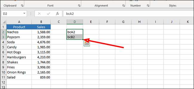 次のセルで、最初のセルで、同じ接頭辞を入力し、次に前のステップで使用したものの右側のセルの位置を入力します。私達の目的のために、それはセルB2になります。これはBCB2として入力します。