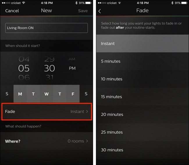 「フェード」は、5分から30分かけてゆっくりとライトを点灯できる機能です。 「インスタント」のままにして、ライトを正常にオンにすることもできます。