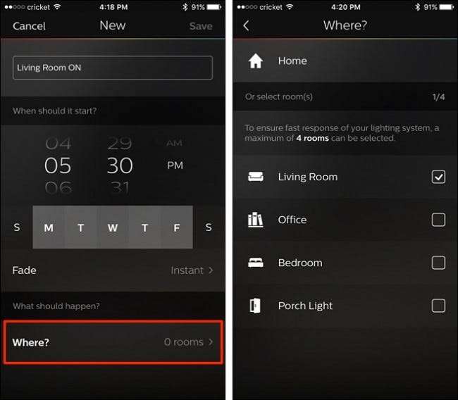 次に、[どこ?]をタップしますオプション。ルーチンでは、個々のHue電球ではなく部屋を選択できるため、部屋の横にあるチェックボックスをタップして選択します。このルーチンでオンにするには、最大4つの部屋を選択できます。
