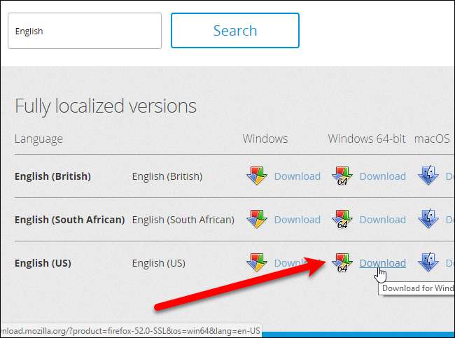 32ビットバージョンのFirefoxを実行している(そして64ビットWindowsを実行している)場合は、 Mozillaのウェブサイトのこのページ 。言語を検索し、Windows64ビットの「ダウンロード」リンクをクリックします。