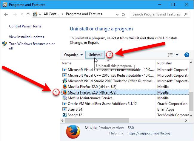 それをするために、 コントロールパネルを開く [プログラム]カテゴリの[プログラムのアンインストール]をクリックします。次に、リストの最後に「(x86en-US)」が付いているMozillaFirefoxエントリを見つけます。インストールしたばかりの64ビットバージョンである「(x64en-US)」が最後に付いているMozillaFirefoxエントリを選択しないでください。