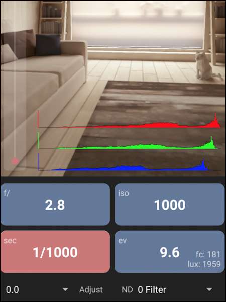 シャッタースピード ダイヤル上に表示されています。 開口部 UIの上部に。利用可能な開口部はF1.4からF22までの範囲で、シャッタースピードは1/8000分の1/8000です。あなたもANを得るでしょう 露出値(ev) ディスプレイの右下の領域で読んで、あなたが単にメーターがあなたに与える設定をプラグインすることができるように私は本当に心配する必要はありません。