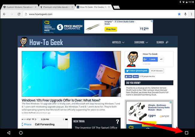 Chromeをフォアグラウンドにして、「最近のアプリ」ボタンを押します。このデモではPixelCを使用しています(ボタンが右端にあるため)が、プロセスはすべてのNougatデバイスで同じです。
