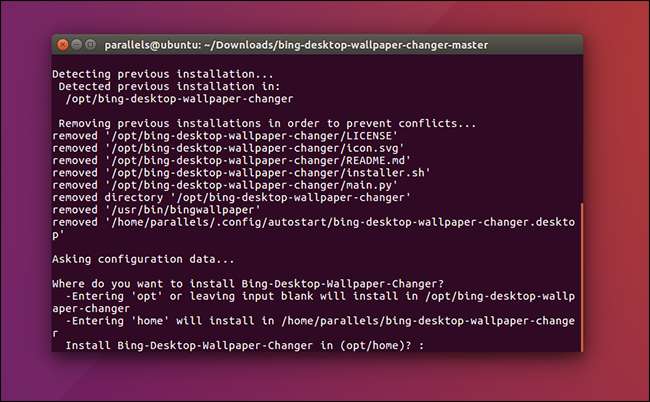 このアイデアが気に入っても、壁紙のBing透かしにわくわくしない場合は、Pythonスクリプトをお勧めします。 Bingデスクトップ壁紙チェンジャー 代わりに。インストールは少し難しいですが、起動時に起動し、毎日新しいBingの壁紙を自動的にダウンロードします。 Ubuntuのパッケージマネージャーでこれをインストールすることはできません。