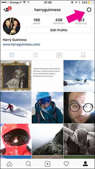Instagramを開き、プロフィールページに移動します。右上の歯車アイコンをタップして、[オプション]画面を表示します。